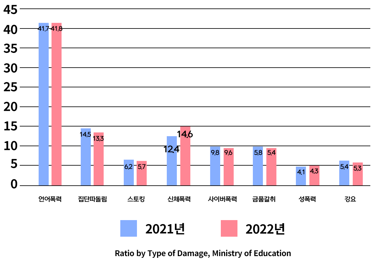 The Ratio of Physical Violence Compared to the one of ‘21, the ratio of Bullying(14.5%→13.3%), Cyber Violence(9.8%→9.6%) was decreased, while the ratio of Physical Violence(12.4 →14.6%) was increased. |