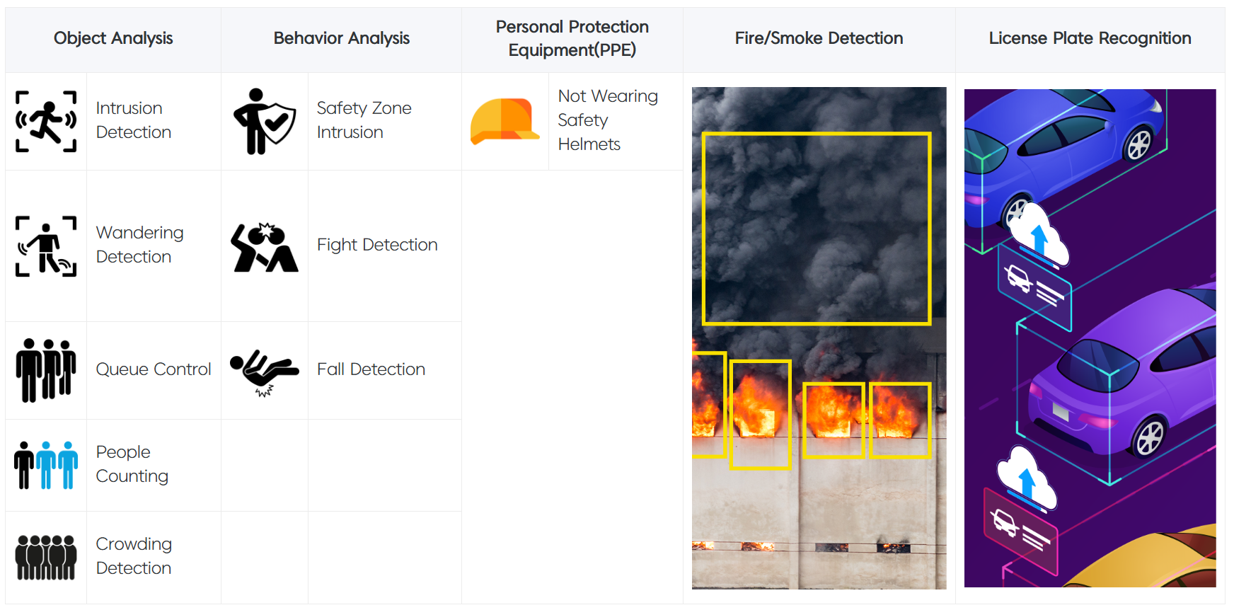 · It provides a user-friendly UI with event duration, object recognition area of interest, and indication of confidence value, etc.
